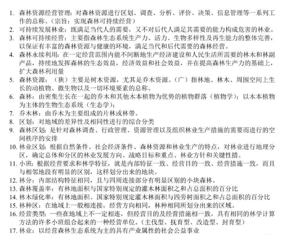 备考《森林经理学》,最致命的误区是把它当成“林业政策汇编”或“公式计算手册”——沉迷于背诵森林区划、资源调查、收获调整、永续利用的条条框框,死记硬背各种生长量、蓄积量、采伐量的计算公式,结果遇到“某林场要编制一份十年经营方案”这类实际问题时,只会罗列一堆调查数据和公式,却看不见这些数字背后是一个动态的、复杂的森林生态系统。这门课的本质不是政策条文,而是以实现森林永续利用为目标,对森林资源进行调查、规划、决策、调控的系统性经营科学