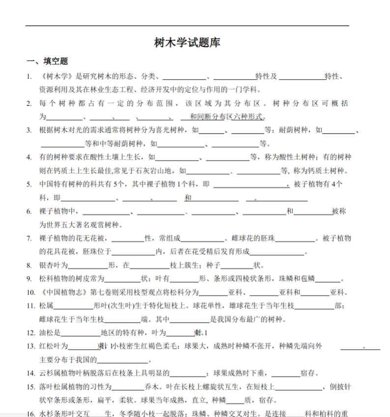 第三,善用“检索表思维”进行鉴定。 考试的本质是给你一个树种特征(如“叶对生、翅果、单叶掌裂”),让你判断它是什么科什么属。复习时,对每一个重点科或属,都要整理出一组“关键识别特征”(如形态、花序、果实、生态习性)。做大量的判断题和填空题(如“雪松和银杏均具有长短枝(√)”、“壳斗科和桦木科的花均为单被花,果实同为坚果(√)”)是巩固识别能力的好方法。