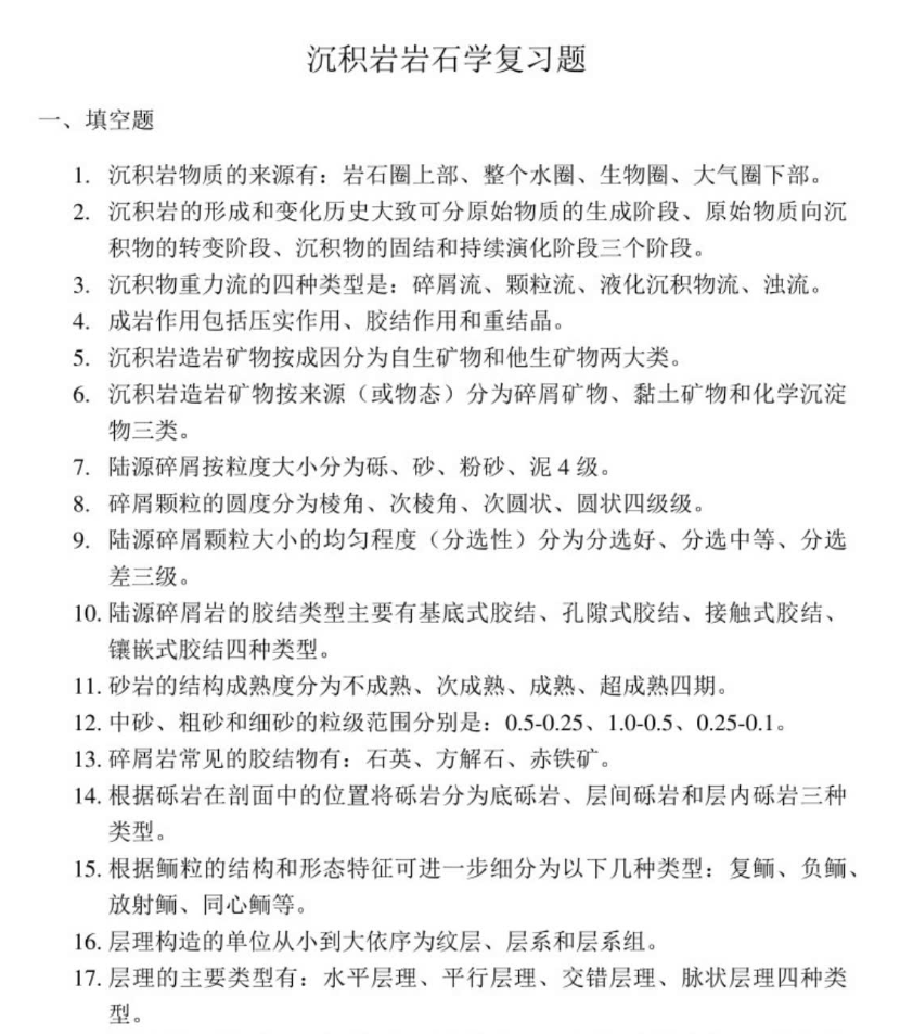 首先,深耕教材核心,搭建知识体系。以指定教材为根本,梳理四大核心模块:一是基础根基,重点掌握沉积岩的物质成分(碎屑颗粒、胶结物、基质)、结构(碎屑结构、泥质结构等)与构造(层理、波痕、结核等),筑牢识别基础;二是岩石分类,牢记碎屑岩、碳酸盐岩、泥质岩等主要岩类的划分标准、成分特征与鉴别要点;三是成因机制,理解沉积作用(搬运、沉积、成岩作用)的核心过程,吃透成岩作用中压实、胶结、交代等作用对岩石的改造逻辑;四是相分析,建立“沉积环境-岩石特征-相模式”的对应认知,掌握河流、湖泊、浅海等典型沉积环境的相标志。
