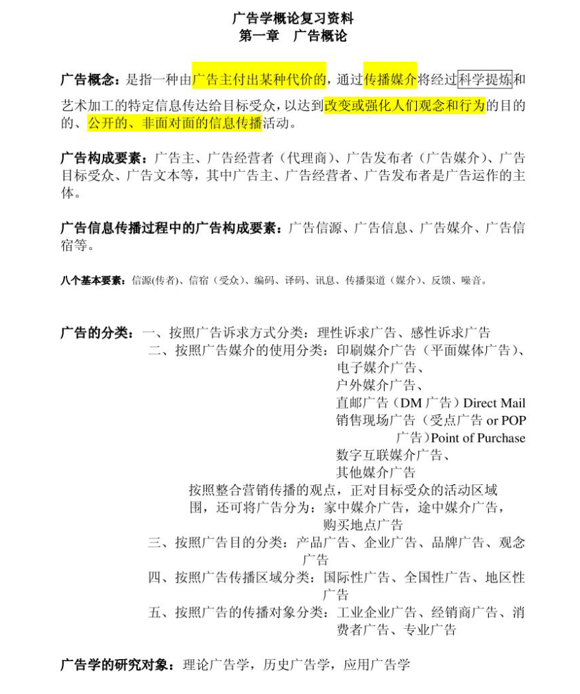 核心概念定义(必须精准背诵):如广告、USP理论、品牌形象、IMC、广告代理制等。这些是名词解释和简答的基础,务必与书中表述一致。