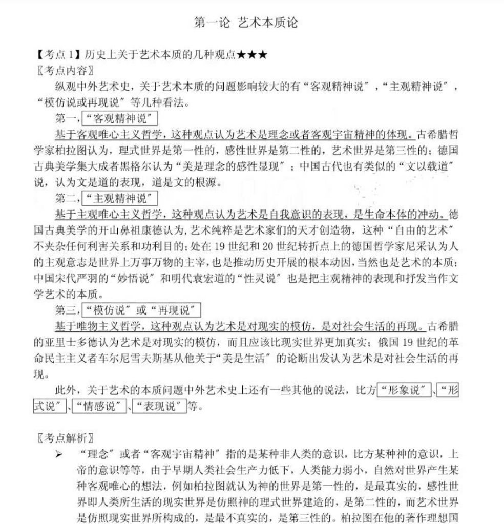 第一,先把书读薄,只留“关键词”。 这本书90%的内容都在解释那几个核心问题:艺术是什么?艺术怎么来的?艺术有什么用?你要做的不是背段落,而是背“核心句”。比如考“艺术的本质”,你只要抓住“客观精神说”、“主观精神说”、“模仿说”这三个流派的代表人物和一两句金句(如“理念的感性显现”),考场上把这些核心词一扔,再用自己的话把它们串起来,分就稳了。别试图用华丽辞藻,老师看的是“理论点”,踩不到点写再多也是废话。