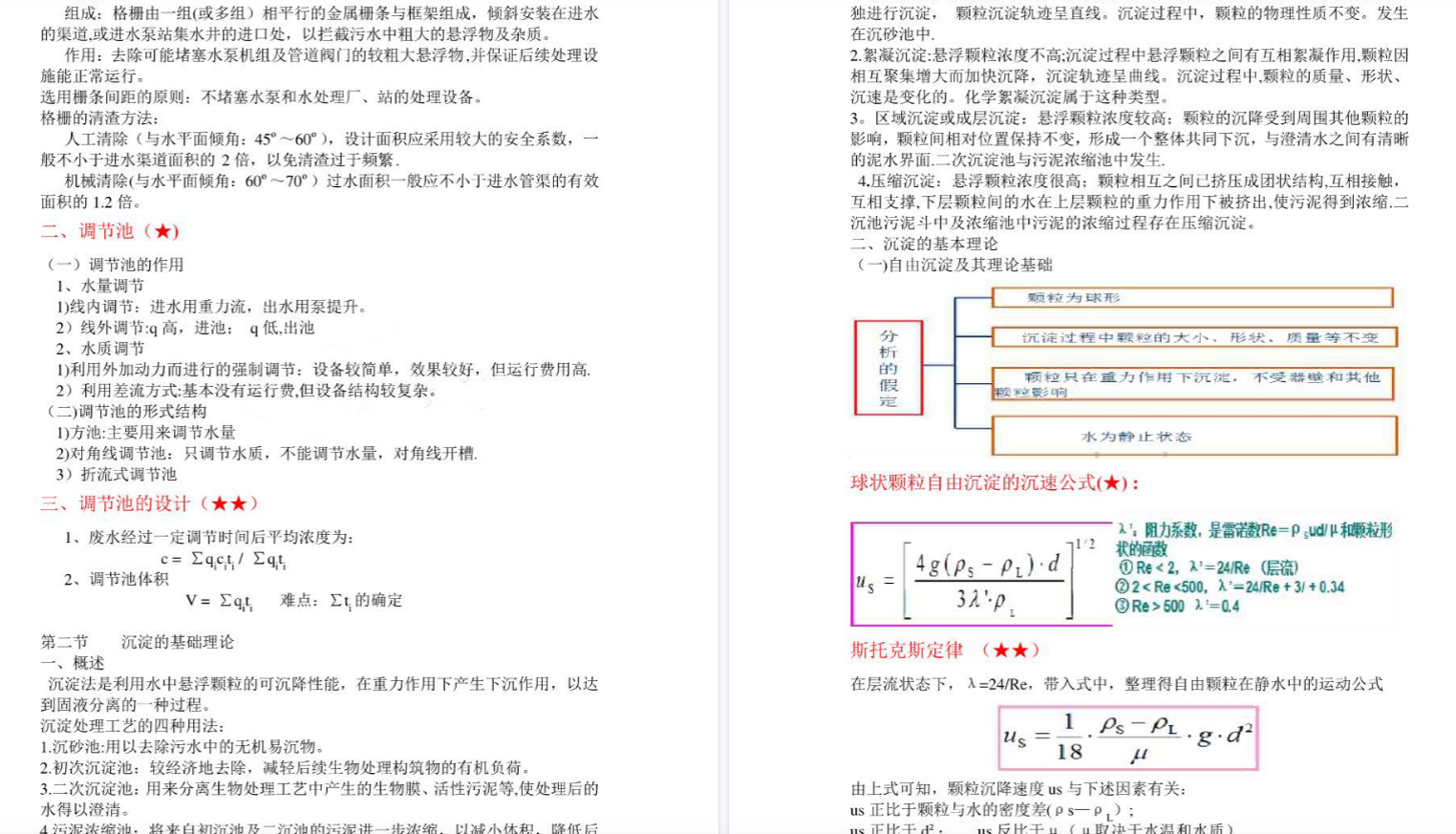 沉淀理论:熟练掌握自由沉淀、絮凝沉淀、区域沉淀、压缩沉淀的区分,以及平流式、竖流式、辐流式沉淀池的优缺点对比与适用条件。