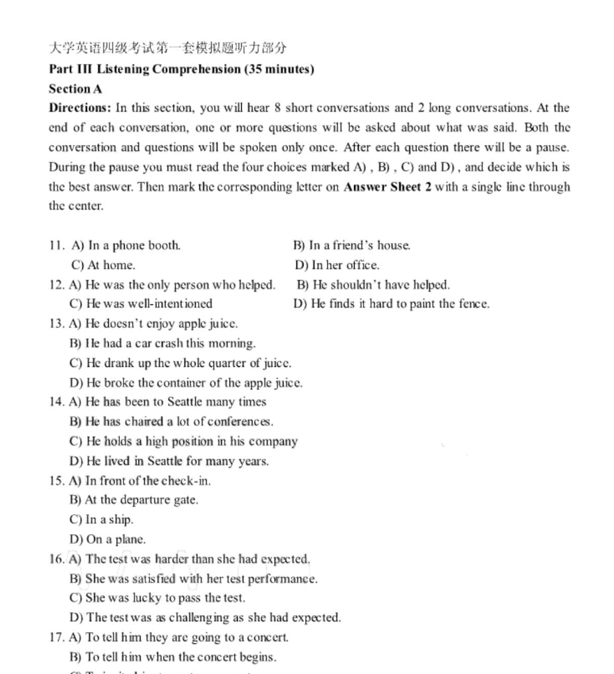 其次,精研题型技巧,强化答题效率。针对四级题型特点逐一突破:听力分题型训练,新闻抓导语、长对话抓逻辑、篇章抓主旨与细节,学会预判选项;阅读讲究策略,词汇理解靠词性匹配,长篇阅读抓定位词,仔细阅读注重选项与原文同义替换;翻译聚焦中式表达优化,积累传统文化、社会发展等高频话题词汇,多用多样句式提升文采;写作采用“三段式”框架,提前积累通用句型与话题素材,确保逻辑连贯、表达规范。