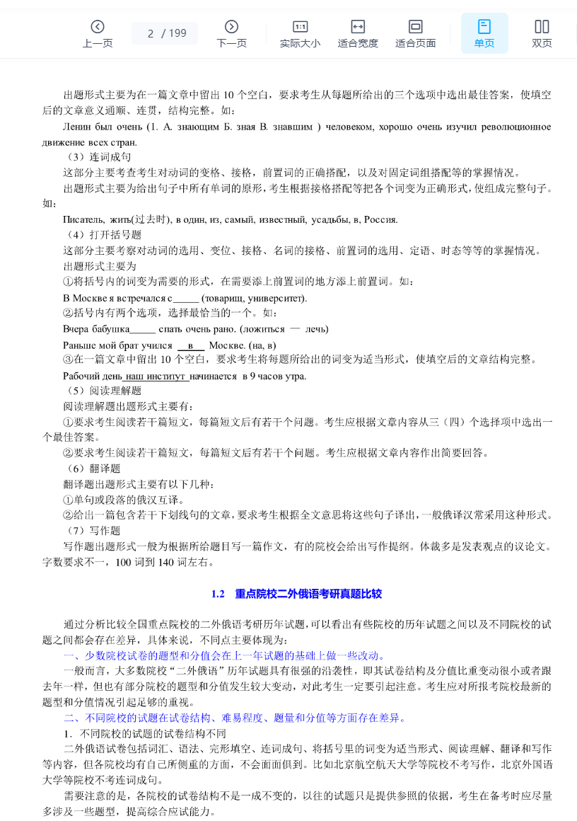 其次,精研真题题型,以详解悟技巧。结合历年真题明确题型(选择题、完形填空、阅读理解、翻译、写作),依托详解拆解应试逻辑。答题范式:选择题借助详解分析干扰项设置,掌握词汇辨析、语法判断的快速解题法;翻译对照详解学习语序调整、固定句型转化技巧,确保语义准确且符合俄语表达习惯;写作参考详解中的范文框架与高分表达,搭建“引言-正文-结尾”结构,合理运用复杂句式提升得分点。