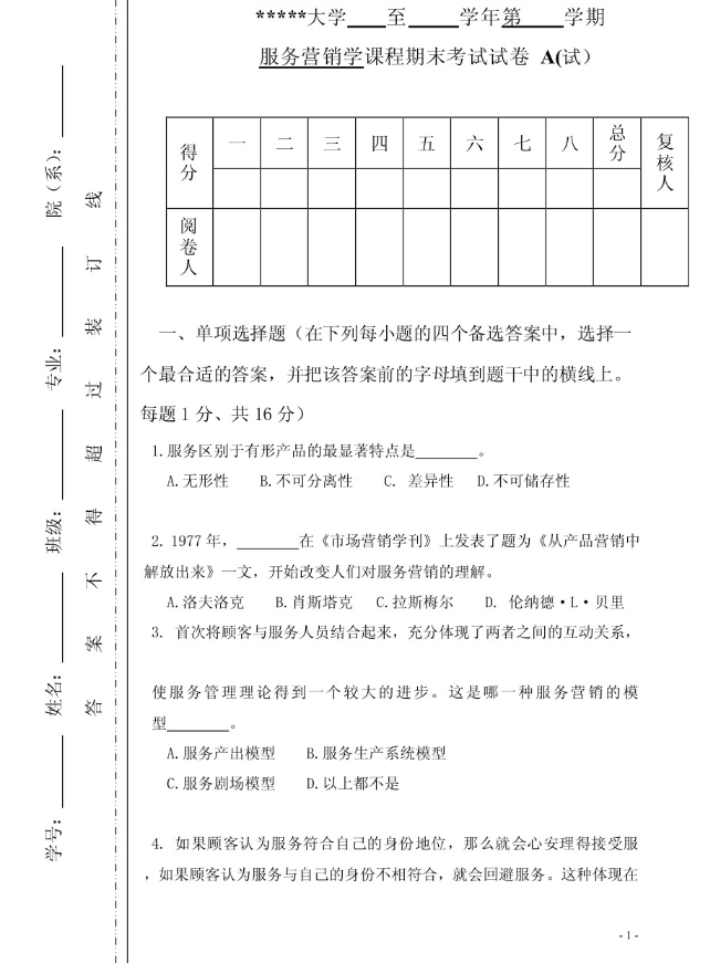 其次,精研题型规律,强化应试能力。结合课程例题、课后习题及历年真题,明确题型分布(选择题、填空题、简答题、论述题、案例分析题),理论应用、策略设计、场景解读是得分核心。答题范式:选择/填空题聚焦理论细节、策略要素与核心概念,确保记忆精准;论述题紧扣理论模型,分层次阐释服务策略的设计思路与实施路径;案例题围绕真实服务场景,拆解问题本质、推导策略方案及效果评估,贴合学科应用导向。