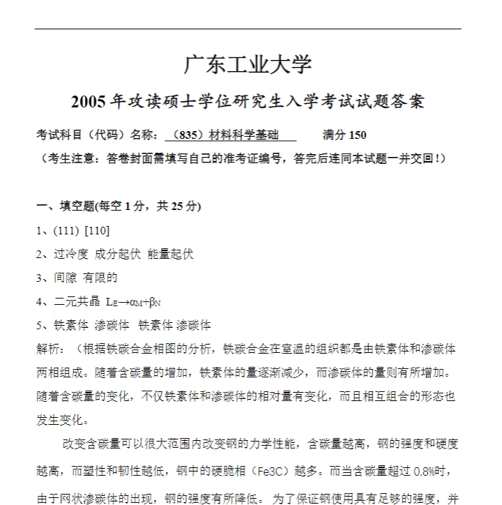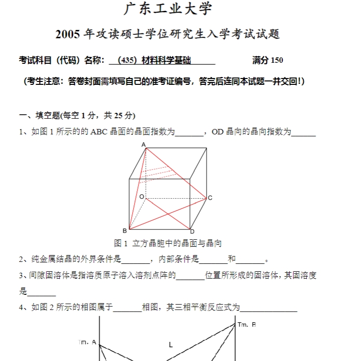 广东工业大学《835材料科学基础》备考核心是“考纲锚定、教材扎根、真题适配、应用导向”。首先明确核心资料体系,优先吃透指定教材(通常为胡赓祥《材料科学基础》),结合院校最新考纲梳理章节范围,剔除超纲内容,搭建“原子结构与键合—晶体结构—缺陷—相图—扩散—塑性变形—固态相变”的完整知识框架,重点标记工科院校高频考点(如晶体结构计算、相图应用、材料性能与微观结构关联),避免知识碎片化。
