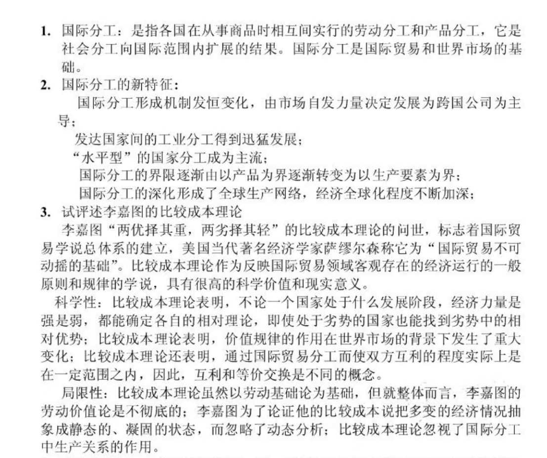 1. 理论基石层(解释“为什么”):核心是理解贸易利得来源。抓住 “比较优势理论”(机会成本差异)→ “要素禀赋理论”(资源差异)→ “新贸易理论”(规模经济与不完全竞争)​ 这条演进主线。关键是明白每种理论解释何种贸易模式(产业间/产业内),及其前提假设。