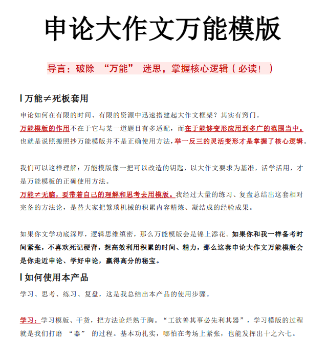 接着,重点突破核心模块这个拉分关键。申论里,归纳概括、综合分析、公文写作、大作文这几块,就占了 100% 的分值,其中小题模块就占了 60%,这些内容几乎每年都会考。很多考生栽在细节上,就是把所有热点都背,其实只需要抓高频的,比如概括题的要点提炼、公文的格式要求、大作文的立意分析,这些都是每年的必考点。备考时一定要把近 5 年的国考真题刷一遍,尤其是要动手写,光看没用,把每道题对应的考点标出来,重点在哪就一目了然了。