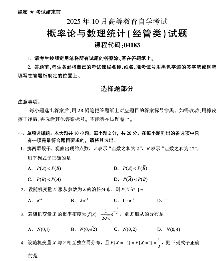 备考04183《概率论与数理统计(经管类)》自考需遵循“概念为基、公式为核、经管场景为用”的逻辑,兼顾理论理解、演算实操与专业场景适配,贴合自考侧重基础应用与综合计算的特点,以下是针对性原创备考建议: