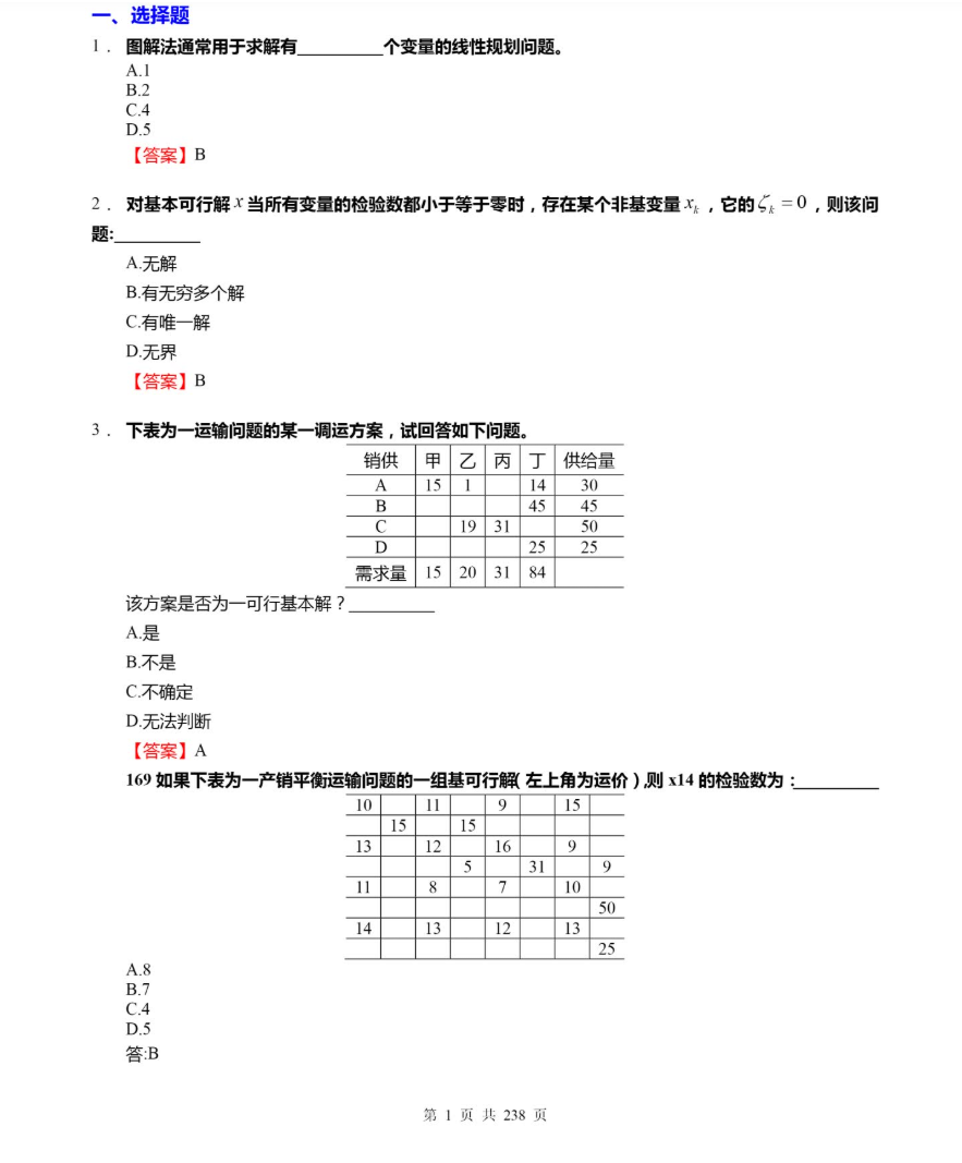 其次,聚焦高频考点,强化习题演练。紧扣线性规划单纯形法、对偶理论、动态规划递推方程、决策树构建等重难点,熟练区分易混淆模型(如目标规划与线性规划的建模差异、确定型与风险型决策的解法边界)。以教材课后习题、经典题库为核心训练载体,结合历年真题分层突破,基础题夯实理论应用能力,难题强化“模型建模+算法求解+结果校验”的综合解题思维。