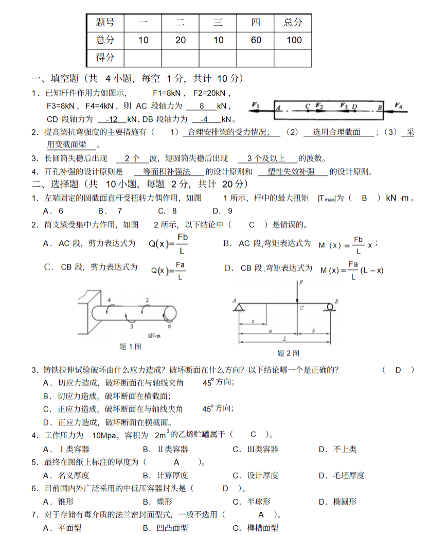 力学基础模块:核心是四种基本变形(拉压、剪切、弯曲、扭转)的受力分析与强度、刚度、稳定性概念。必须掌握内压薄壁容器的应力公式。