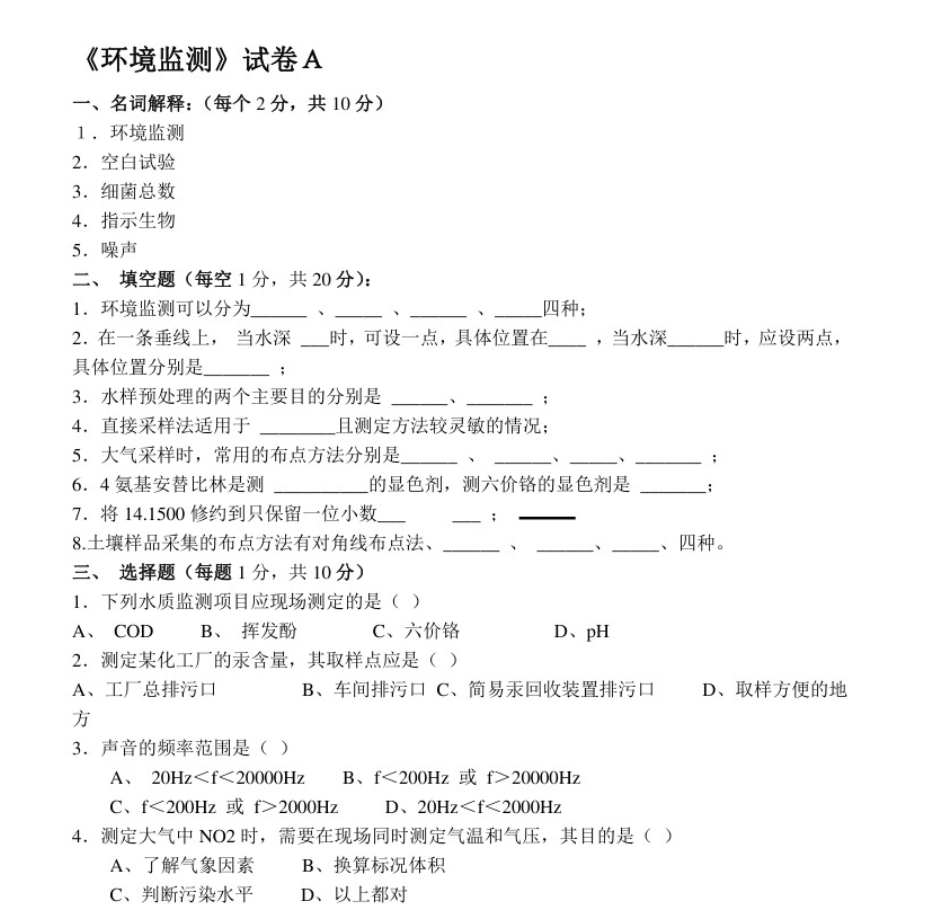 环境监测基础:掌握 基本概念、监测目的与分类、环境标准体系。重点理解 “误差、偏差、灵敏度、检出限、测定下限” 等关键术语及计算方法。