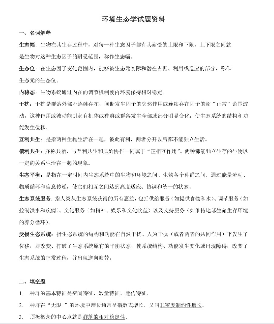 5. 关注前沿与理念:了解 “生态系统服务”、“基于自然的解决方案”、“生态安全格局”、“山水林田湖草沙生命共同体”​ 等前沿理念,思考其生态学基础,以备开放论述。