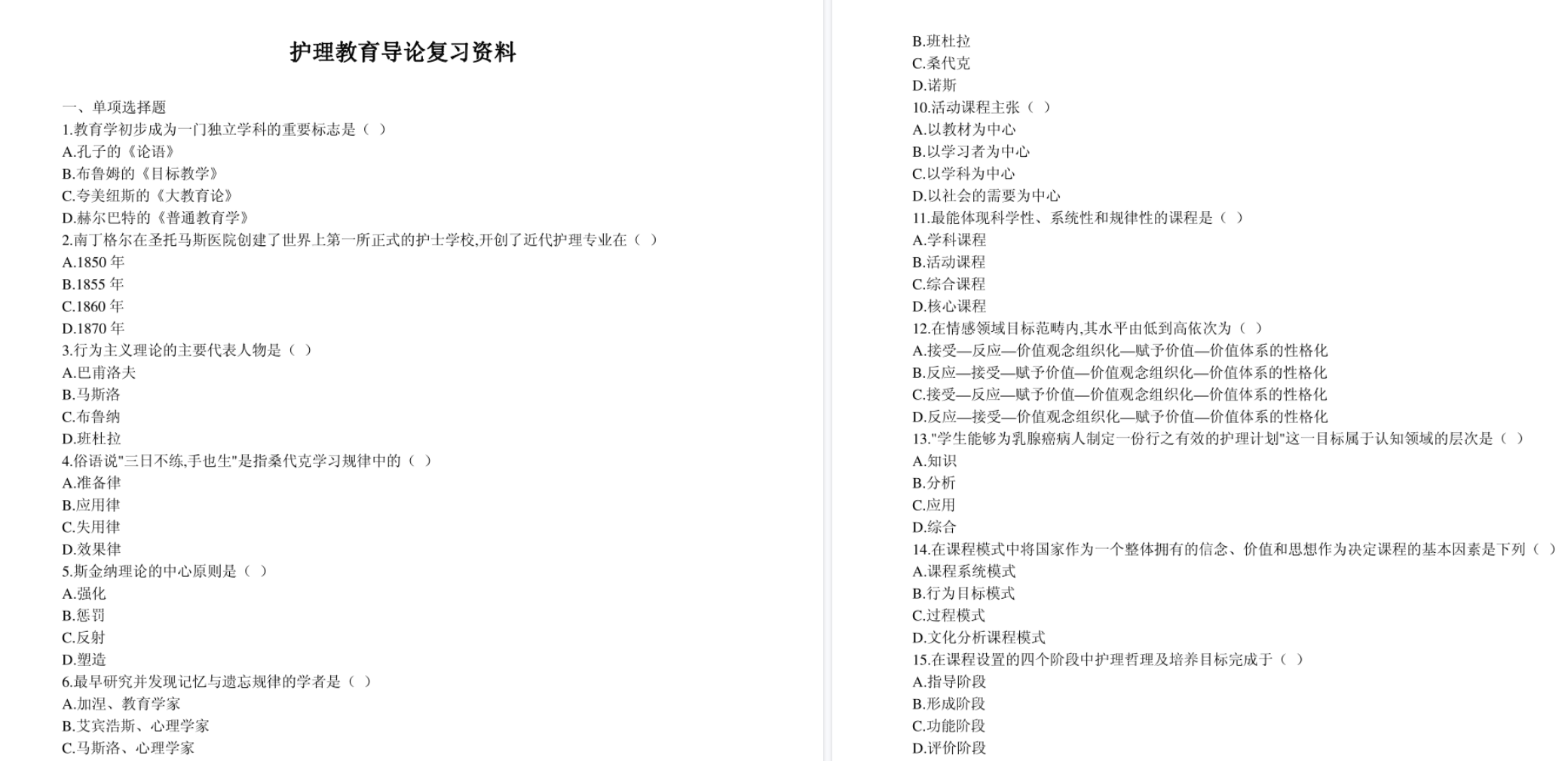 4. 强化记忆关键人物与理论:准确记忆主要教育家(如布鲁姆、加涅等)及其核心理论观点,以及护理教育中的核心概念(如带教制、见习、实习等)。