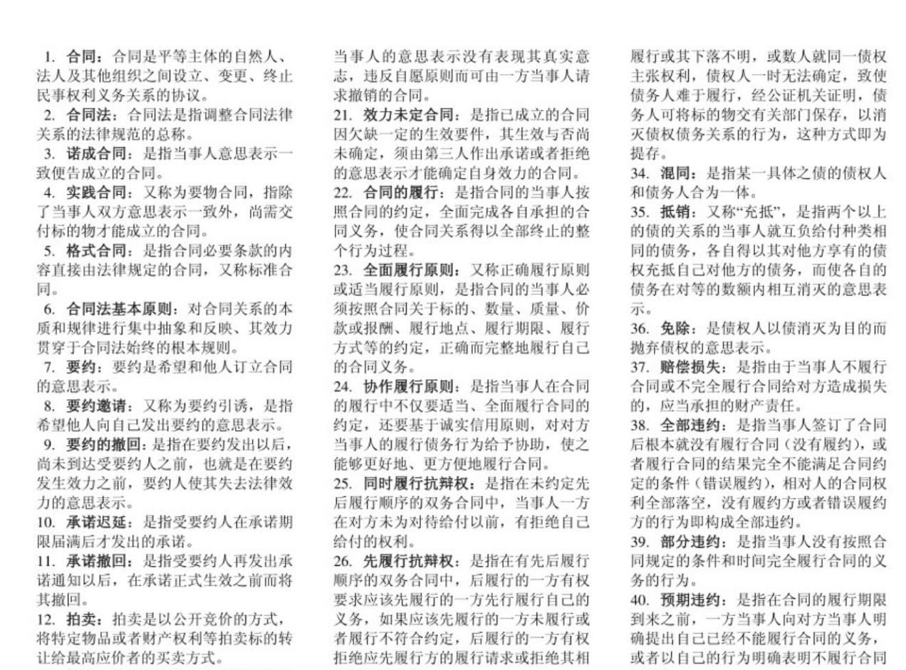 违约责任:这是“合同的牙齿”。掌握 违约形态(不履行、迟延履行、瑕疵履行等)、归责原则(通常为严格责任)、责任形式(继续履行、赔偿损失、违约金、定金)。重点理解 损害赔偿的范围(可预见规则、减损规则)和 违约金与定金的适用规则。
