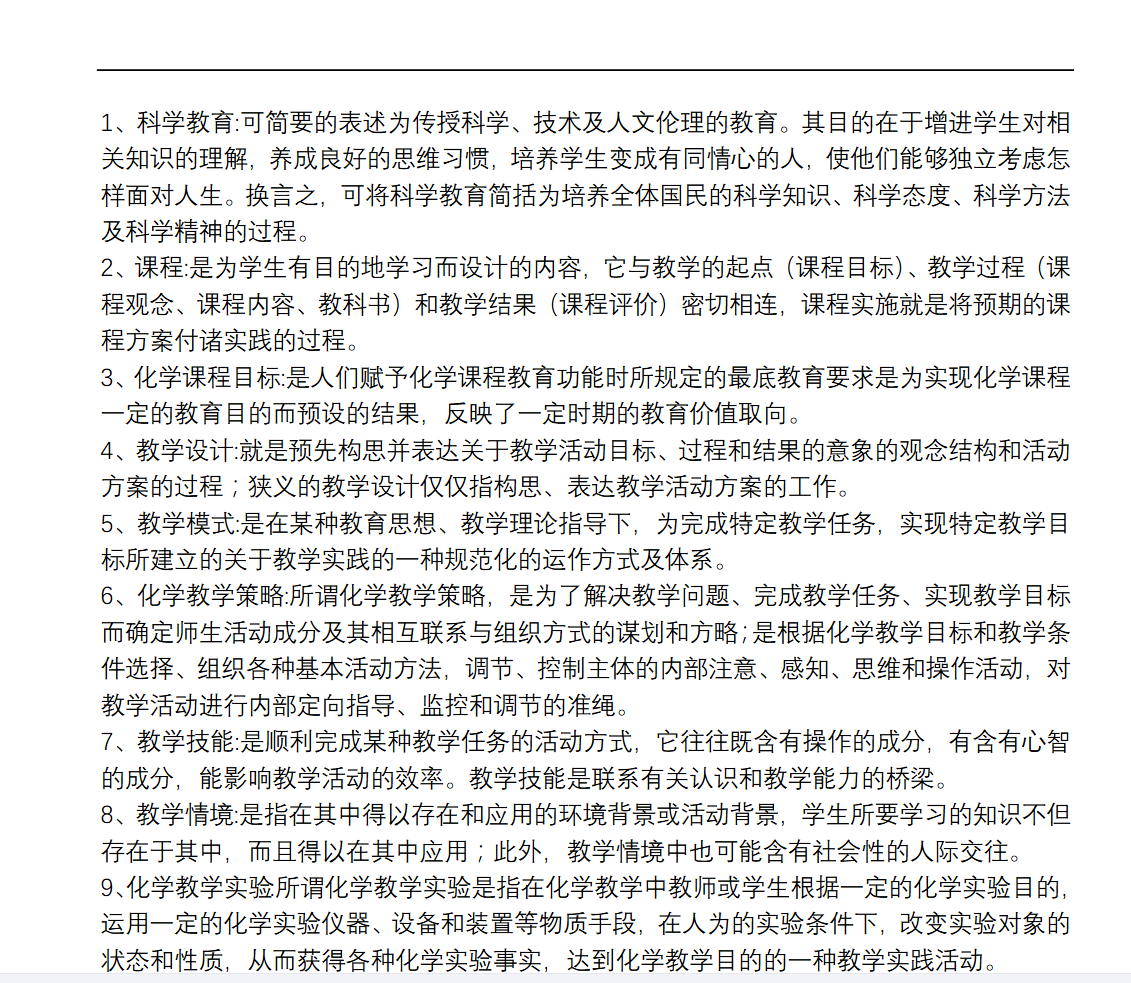 化学课程与教学内容:了解化学课程的设置与标准(如初高中化学课程标准),理解 核心概念 的选取与组织,能对教材内容进行初步分析。