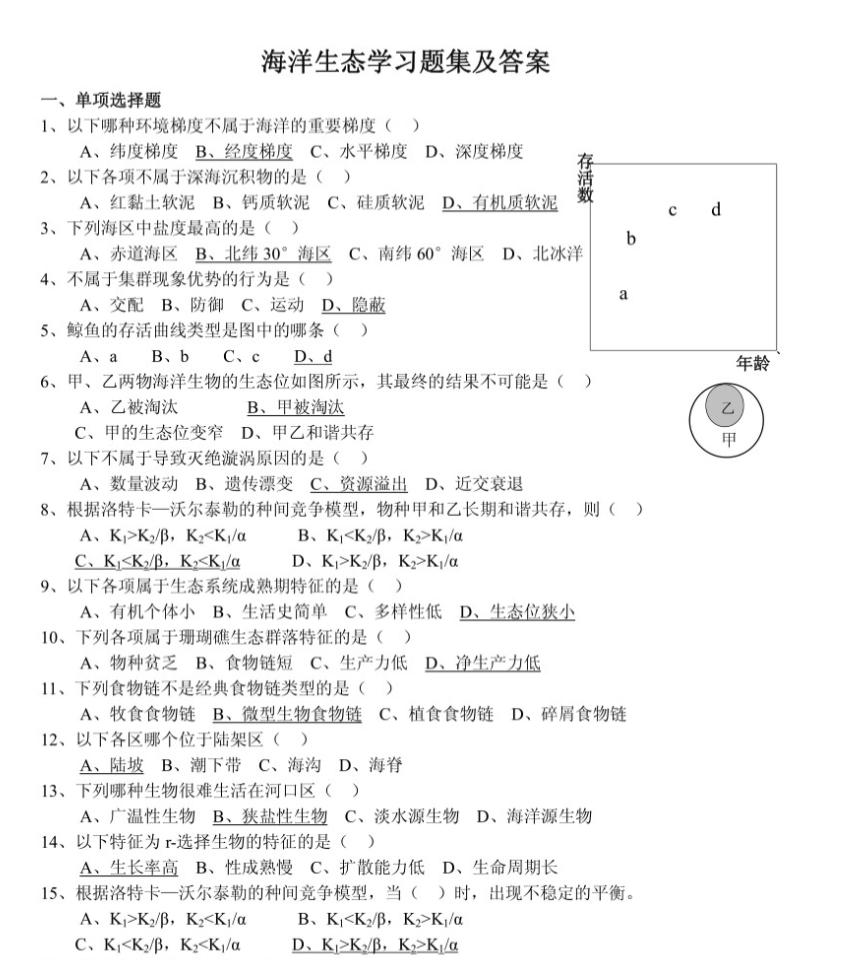 个体生态学(基础):了解海洋生物如何适应环境(温度、盐度、光照、压力等),掌握 限制因子定律、生态位 等核心概念。