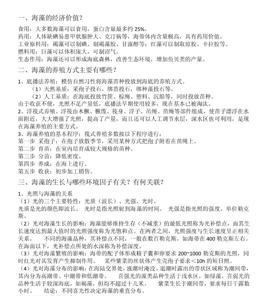 • 新技术与新业态:了解如 良种选育(如高产、抗逆品种)、生态综合养殖(IMTA,如鱼-藻混养)、海藻碳汇​ 等前沿方向。这可能是论述题的拓展点。