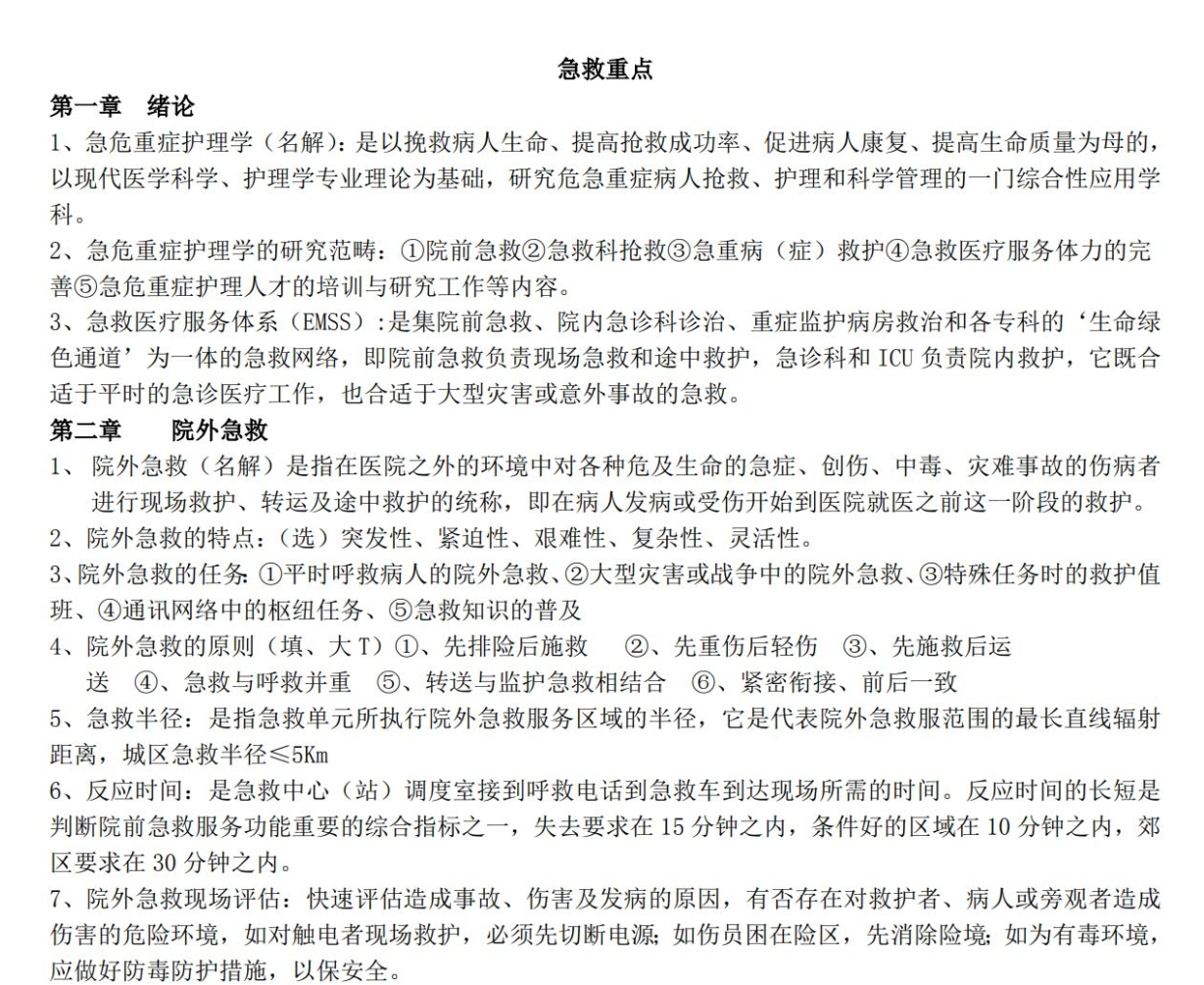 核心急救护理技术:这是“保命”技能。必须精通 心肺复苏、电除颤、气道管理、止血包扎固定搬运、抗休克、急救药物应用 等技术的 目的、操作流程、要点、并发症预防。操作标准(如CPR按压深度、频率)必须精确记忆。