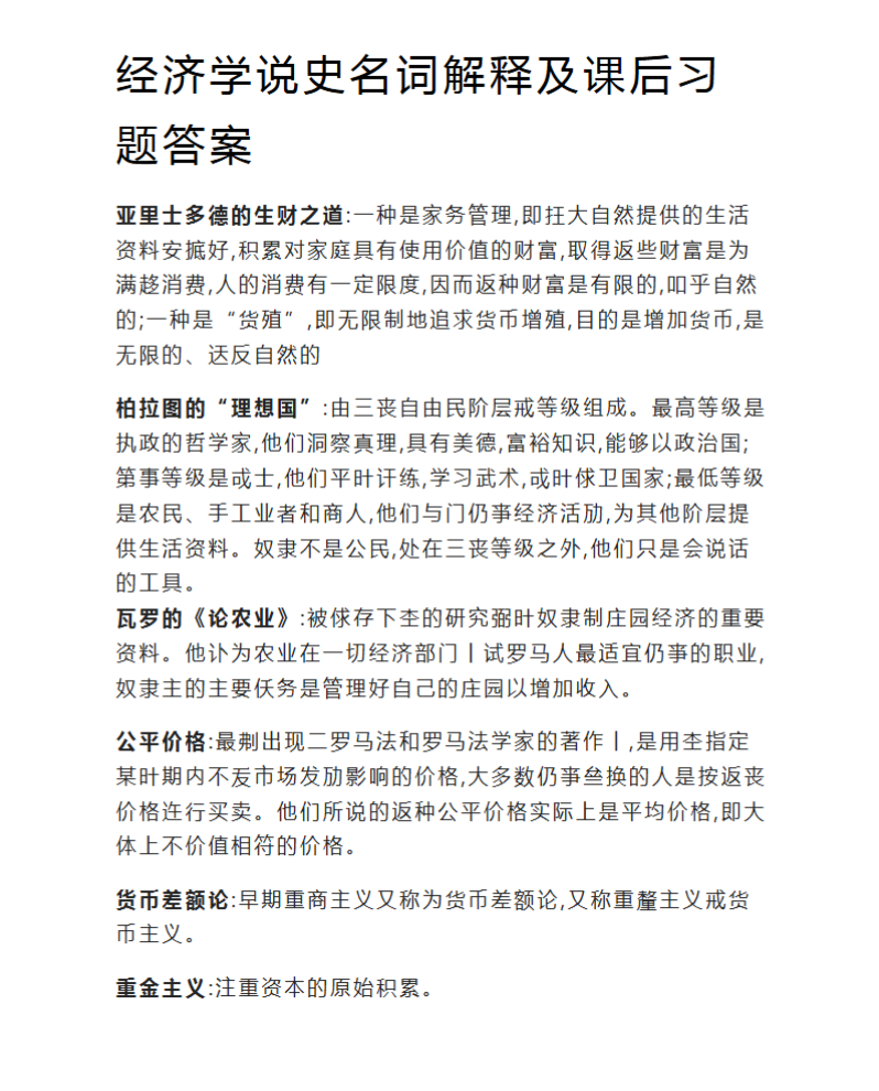 1. 明确历史分期与思想转折点:清晰梳理从 前古典(重商、重农)→古典(斯密、李嘉图、马克思)→新古典(边际革命、马歇尔)→现代宏观(凯恩斯及之后)​ 的演进主线和关键转折。