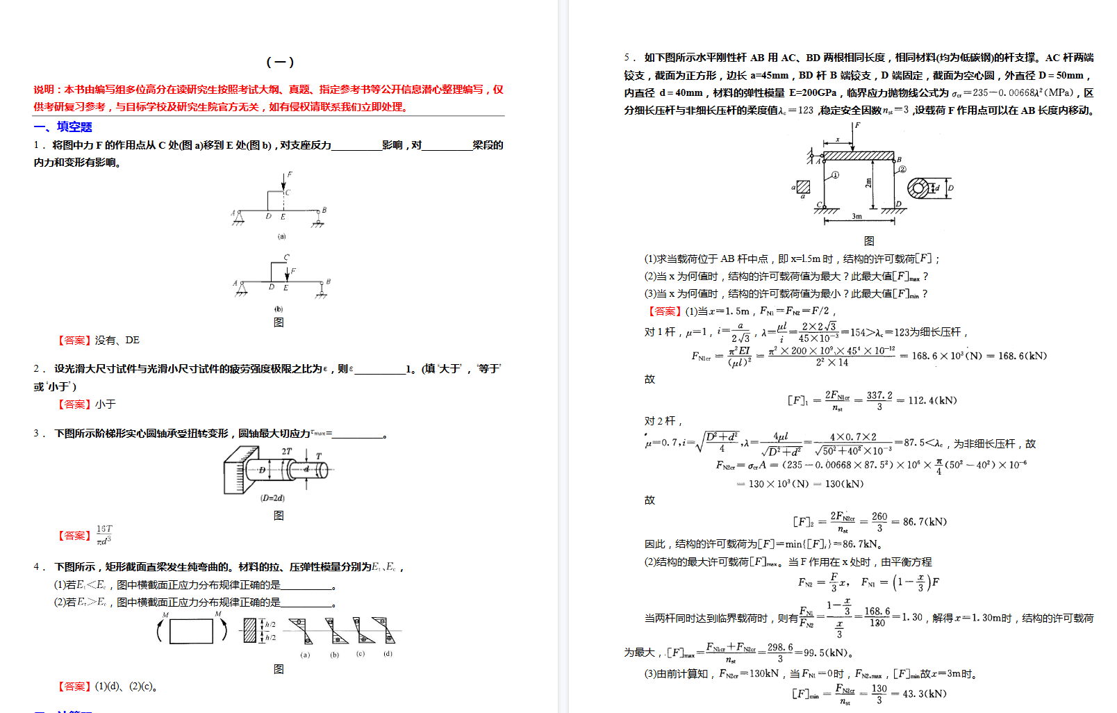 强化“综合性工程问题”解决:限时完成结合了 弯曲、扭转甚至稳定 的综合性题目。答案需步骤清晰、分析到位、计算准确。