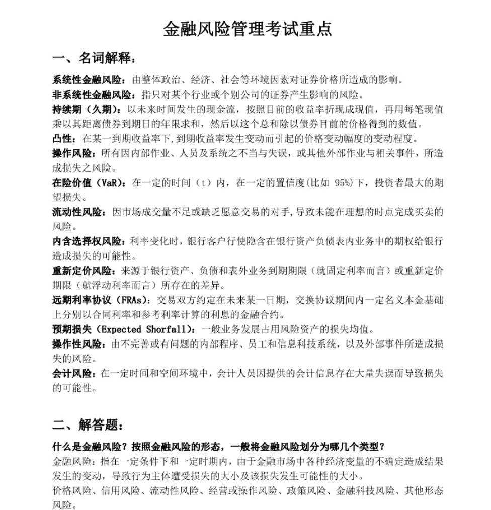 备考《金融风险》,你需要把握其作为 “理论与实务的交叉点”​ 的核心:它在数理模型与市场现实之间架桥,旨在系统化地识别、度量与管理金融市场中的各类潜在损失。​ 备考关键在于 “构建‘风险识别-量化模型-管理控制’的知识闭环,精通主流风险(市场、信用、操作)的计量逻辑与工具,并能运用风险思维分析真实金融案例”。
