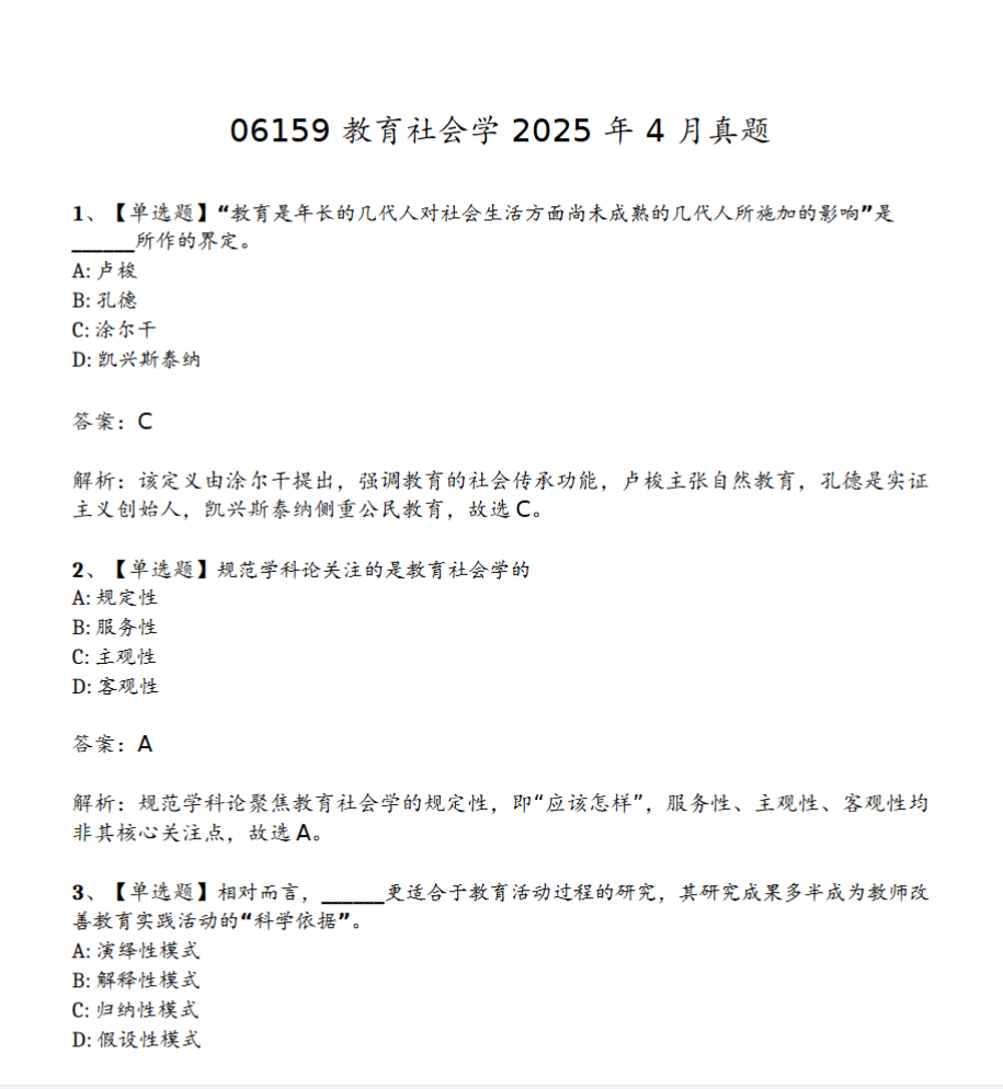 三、强化实战演练,规范答题逻辑。利用章节习题、历年真题开展针对性训练:1. 答题规范:参考真题答案,明确识记题“术语准确、表述完整”、分析题“理论支撑—现象佐证—逻辑连贯”、论述题“脉络清晰—论据充分—贴合现实”的答题结构;2. 专项训练:集中练习核心理论识记、概念辨析、教育社会现象分析、教育政策解读等高频题型,严格控制答题时间,提升解题效率;3. 复盘优化:整理错题本,标注理论记忆偏差、概念混淆、关联分析不深入等问题,针对性回归教材补弱,积累规范答题话术与教育社会学分析技巧。