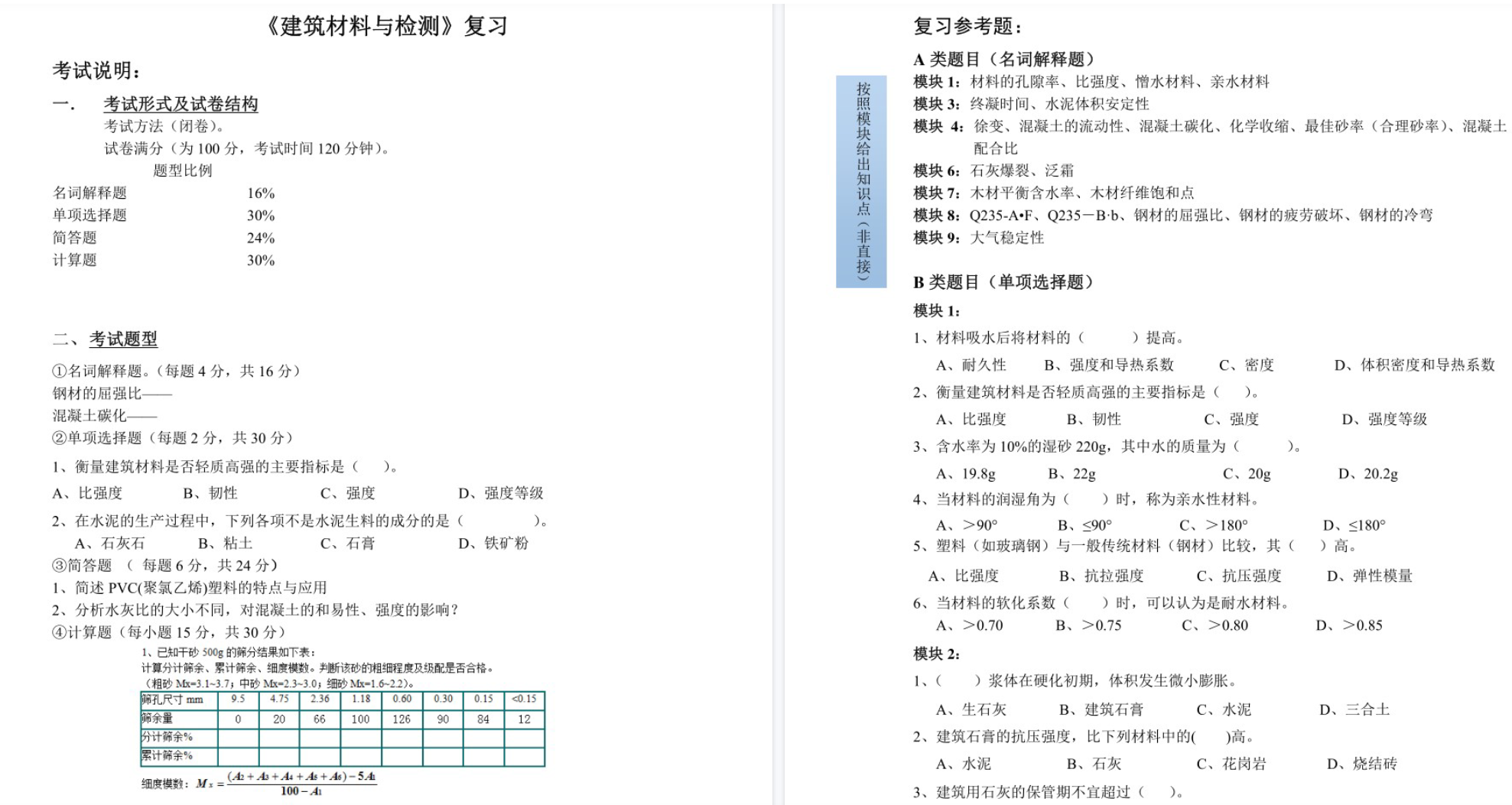 专题整合复习:围绕“水泥全套性能检测专题”、“混凝土配合比与强度评定专题”、“钢筋力学性能试验专题”进行整合,将理论性质与试验方法紧密捆绑复习。