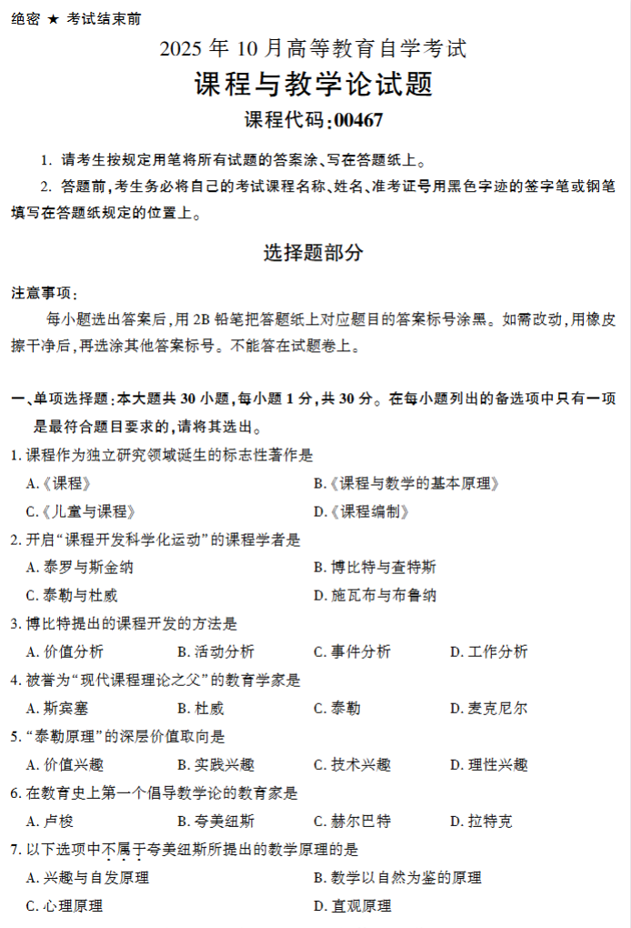 00467《课程与教学论》备考核心是掌握课程与教学的基础理论、核心要素及实践设计逻辑,紧扣“理论扎实+设计规范+实践适配”的备考要求,聚焦理论基础、课程设计、教学实施三大核心模块,通过“夯实基础—考点突破—实战演练”的节奏,实现理论记忆与课程教学实践分析能力的同步提升。该科目侧重考查核心概念识记、课程教学理论应用、课程设计方案撰写、教学策略选择等内容,兼顾识记、理解与实践设计能力,具体建议如下: