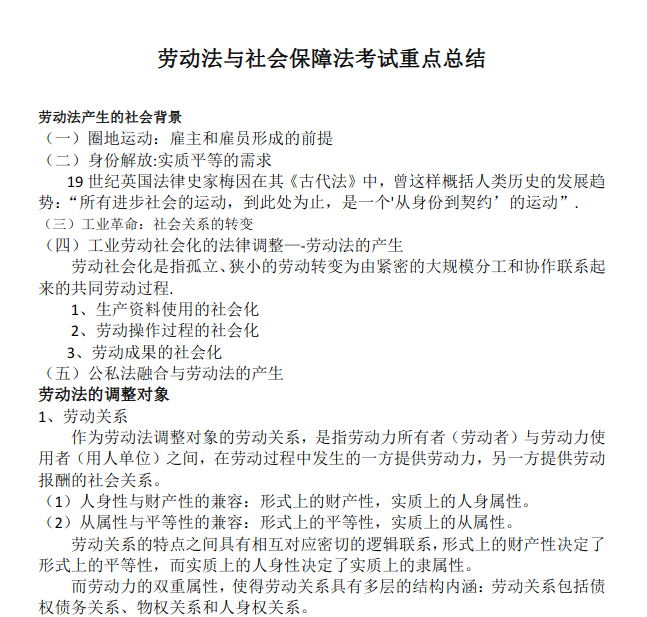 劳动法学部分:核心是围绕“个别劳动关系”(劳动合同)与“集体劳动关系”(工会、集体协商、民主管理)展开,以“倾斜保护劳动者”为基本原则,构建了从就业促进、劳动合同订立履行变更解除、劳动基准(工资工时休息休假安全卫生)、劳动监察到劳动争议处理的完整制度链条。