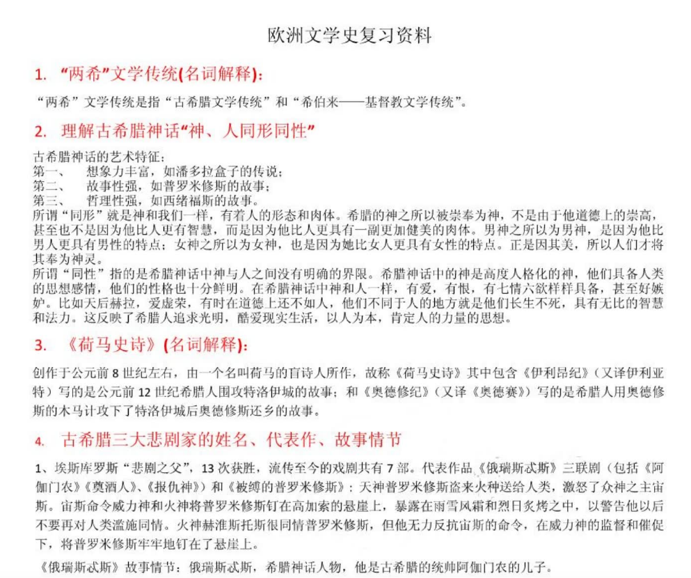 第一,从“国别割据”跃升为“问题史视野”。 绝大多数考生按英国、法国、德国、俄国、意大利等章节顺序死守,这是辞典的分类法,不是文学史的逻辑。高分考生的知识库是按欧洲文学千年追问重组的:人在神面前的位置(中世纪)、人在君主面前的位置(古典主义)、人在理性面前的位置(启蒙)、人在资本面前的位置(批判现实主义)、人在虚无面前的位置(现代主义)。 建议手绘一张“欧洲文学核心命题接力图”,横轴是时间,纵轴是空间(各国文学出场时段),把荷马史诗对命运的抗争、但丁对灵魂中世纪的告别、塞万提斯对骑士理想的解构、歌德对浮士德精神的现代性忧虑、陀思妥耶夫斯基对理性乌托邦的质疑,连成一条跨越两千年的思想心电图。合上笔记能从“个体与社会冲突”这个命题,依次调出《安提戈涅》《哈姆雷特》《红与黑》《变形记》并说出每一部作品对这个命题的独特贡献。