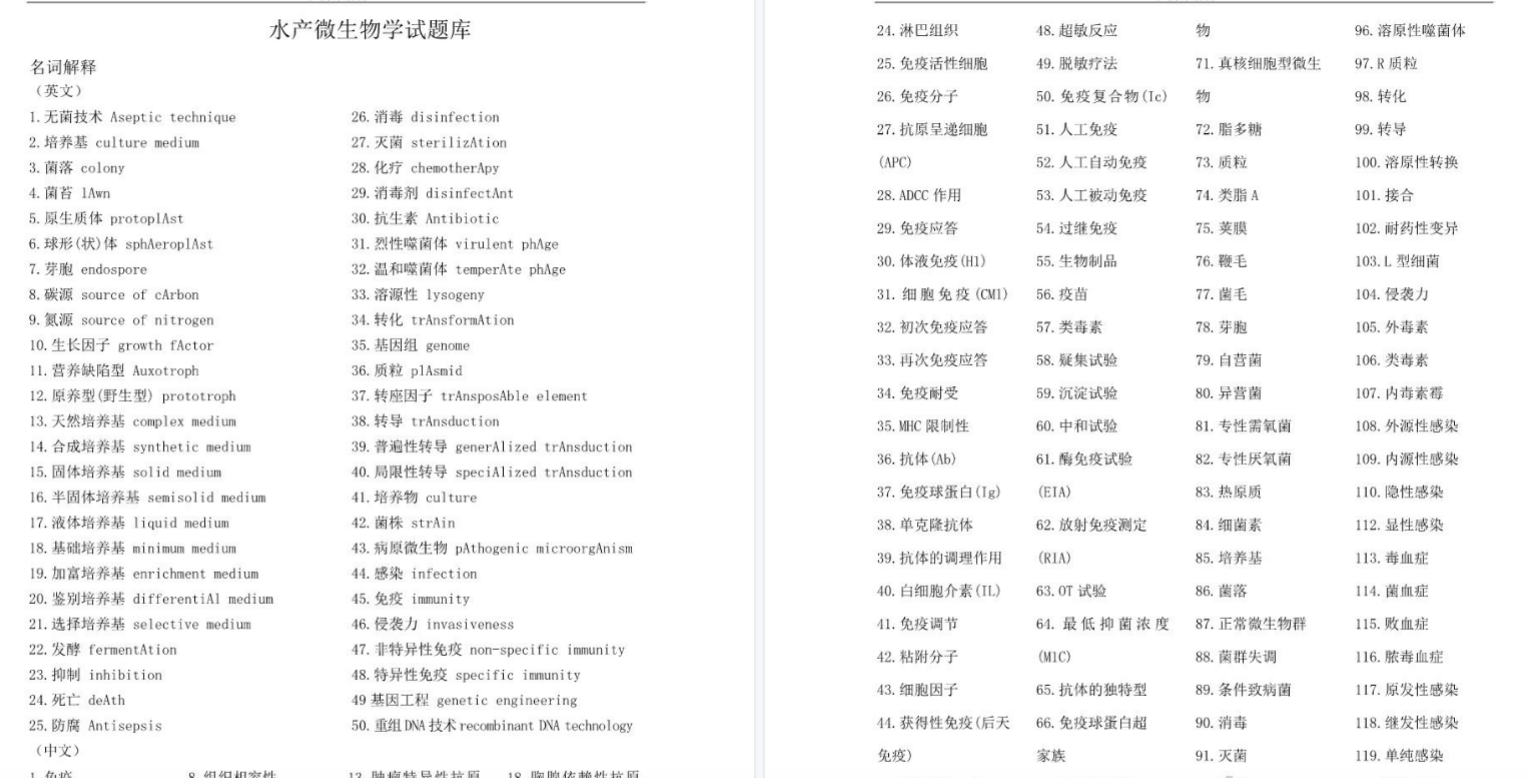 • 致病性与免疫:重点掌握细菌的毒力因子(内外毒素)、病毒的感染与复制过程、以及水产动物的免疫机制(非特异性免疫和特异性免疫)。这部分是解释疾病爆发的理论基础。