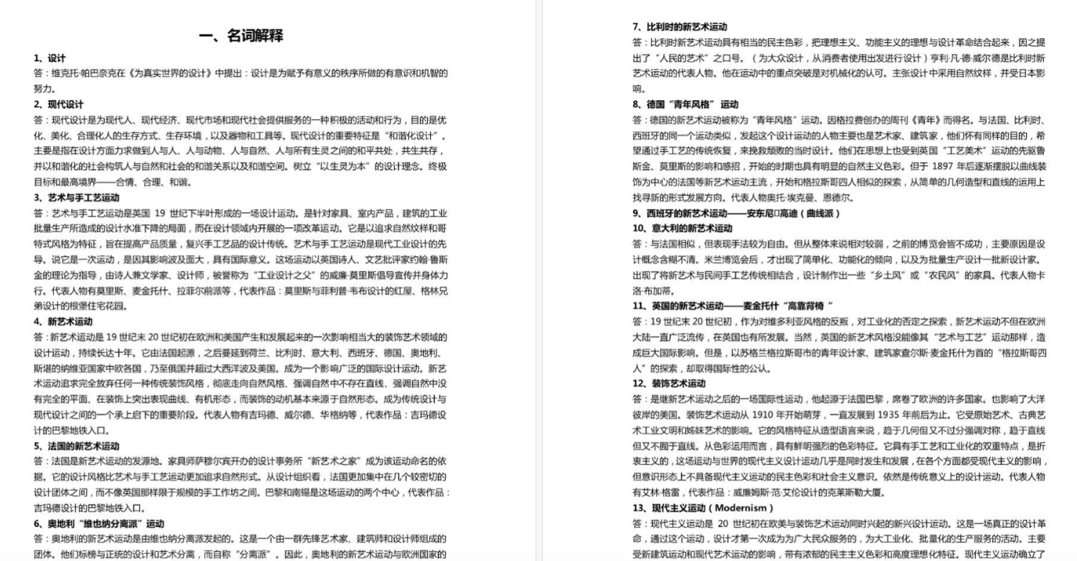 • 五大运动:工艺美术运动、新艺术运动、装饰艺术运动、现代主义设计(含包豪斯)、后现代主义设计。每个运动要按“背景+主张+风格+代表+影响”五要素吃透。