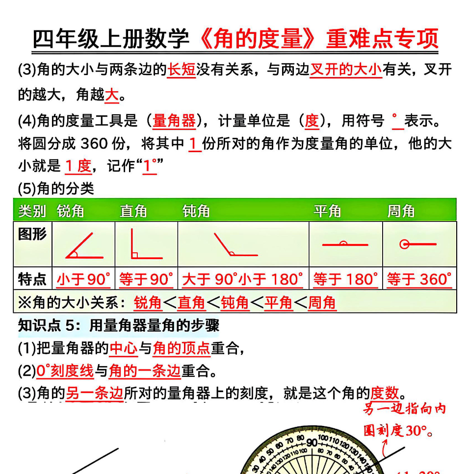 《角的度量》是四年级上册数学的核心操作单元,考查重点集中在角的概念理解、量角器的正确使用、角的分类与换算,以及简单角度计算,题型兼顾基础操作与实际应用。备考核心需夯实基础概念、强化实操技能、突破易错点,具体建议如下: