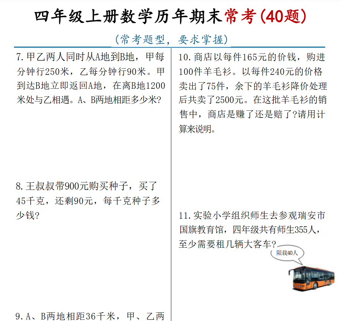 历年期末常考40题浓缩了全册高频考点与典型题型,备考核心是通过这40题精准锁定重点、强化解题熟练度、优化应试技巧,实现“以题带点、以练促能”。具体建议如下:
