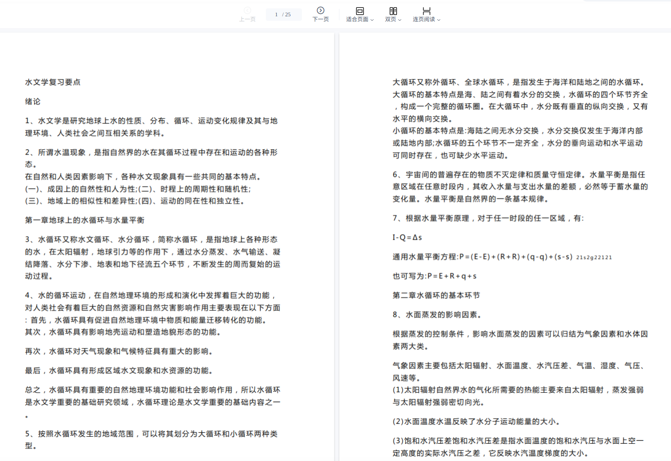 第一,以“水循环”为逻辑主线重构知识体系。 水文学的知识体系由水文循环、水量平衡、产汇流理论三大支柱构成。建议手绘一张“水循环全流程图”,从降水(点/面雨量计算)开始,经过下渗(土壤水运动、下渗曲线)、蒸散发(水面/土壤/植物蒸发),到产流(蓄满产流/超渗产流的机理与判别),再到汇流(坡面/河网汇流、单位线法),最后到洪水演进(槽蓄原理、马斯京根法)。把教材各章挂载到这条“降水-径流”的主线上。
