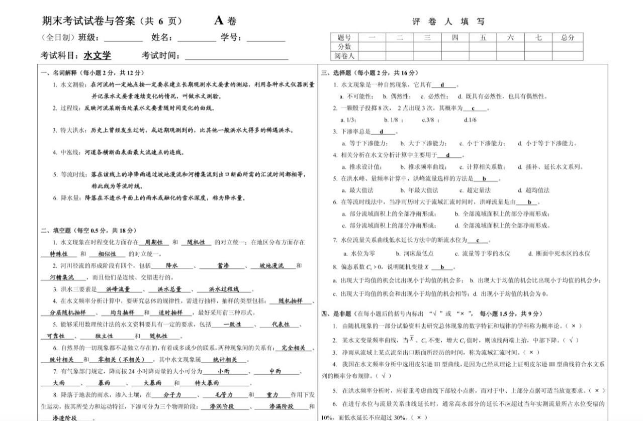 第三,建立“水量平衡”的全局意识。 水量平衡是贯穿水文学的“总方程”。从闭合流域多年平均水量平衡(P=R+E)到一次降雨的包气带水量平衡,必须能熟练运用。同济大学真题中多次出现水量平衡相关的选择题和计算题。