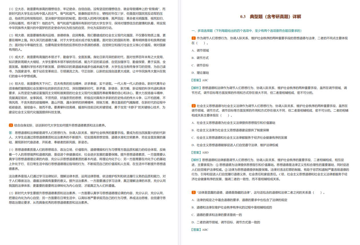 第三,善用配套学习指导,强化“刷题”训练。 中国农业出版社出版的两种《思想道德与法治学习指导(2023年版)》也是极佳的辅助材料。其中范碧鸿主编的版本包含“复习与巩固”部分,涵盖单项选择题、多项选择题、辨析题、简答题、材料分析题、论述题以及历届考研真题七个题型。钟海燕主编的第二版则包含“历年考研真题及解析”模块。务必做到:先独立完成题目,再对照答案修正思路。