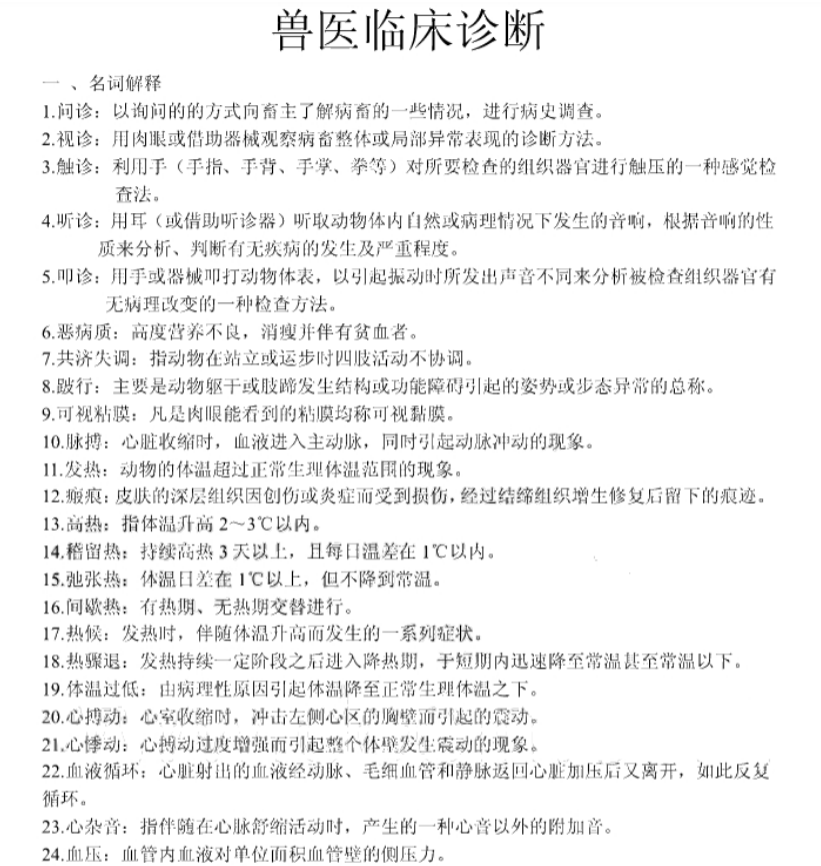 第一,以“临床检查方法”为逻辑主线重构知识体系。 兽医临床诊断的灵魂是“视、触、叩、听”。建议手绘一张“临床检查流程图”,从一般检查(体温、脉搏、呼吸)开始,延伸到系统检查(心血管、呼吸、消化),最后到辅助检查(X线、B超、实验室)。把生理指标、病理体征挂载到对应的检查方法上。