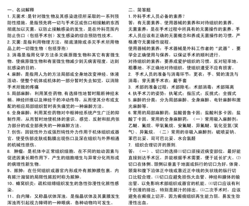 • 无菌术:灭菌与消毒的区别、手术器械的消毒方法、手术人员及动物术部的准备(特别是刷手、消毒顺序)、手术室的卫生标准。这是外科医生的基本功,也是高频考点。