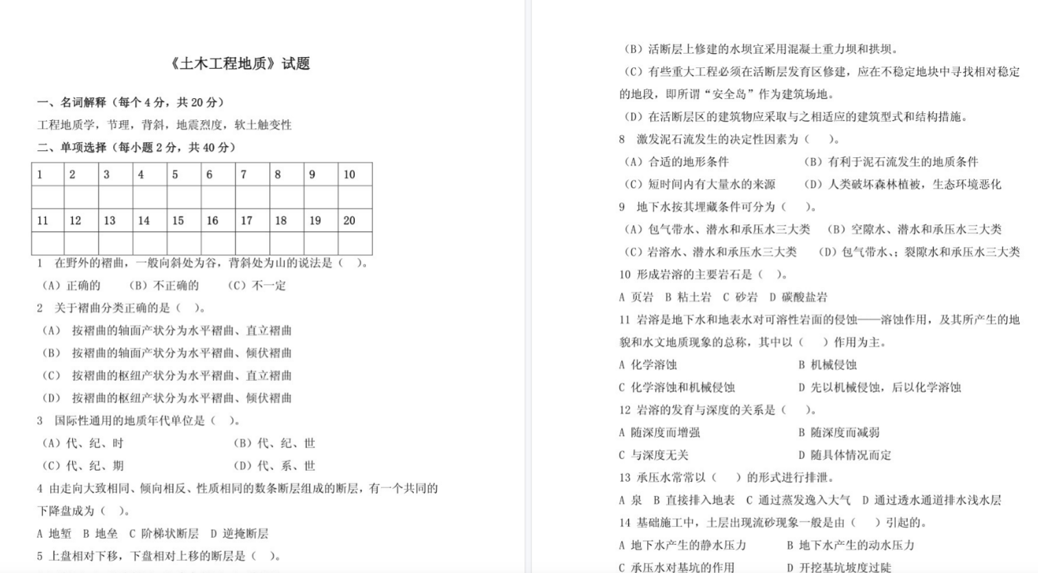 备考专业课《土木工程地质》,需立足工科实用性,兼顾理论记忆、地质现象分析与工程应用,贴合课程核心逻辑高效备战。首先,梳理教材核心框架,重点掌握地质作用、岩石与土的分类及性质、地质构造等基础模块,牢记核心概念、地质现象特征及判断方法,明确各知识点内在关联,筑牢理论根基。其次,聚焦高频考点,熟练掌握地震、滑坡、崩塌等不良地质现象的成因、危害及防治措施,结合工程实例深化应用理解,避免机械记忆。最后,结合真题强化巩固,梳理易错分析类、应用类题型,定期复盘总结,兼顾理论背诵与案例分析,吃透教材重点、理清地质与工程的关联,提升应试解题能力,从容应对专业课考试。