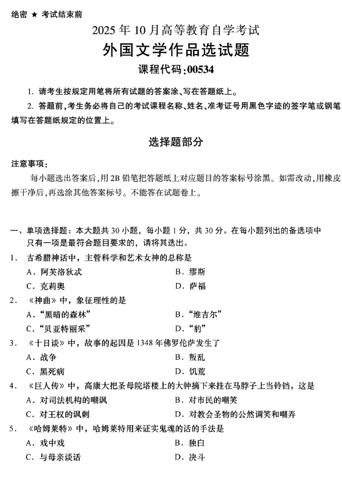 备考00534《外国文学作品选》自考需遵循“国别为基、流派为脉、赏析为要”的逻辑,兼顾作家作品识记、流派思潮梳理与异域文学解读,贴合自考侧重识记、简析与主题阐释的特点,以下是针对性原创备考建议: