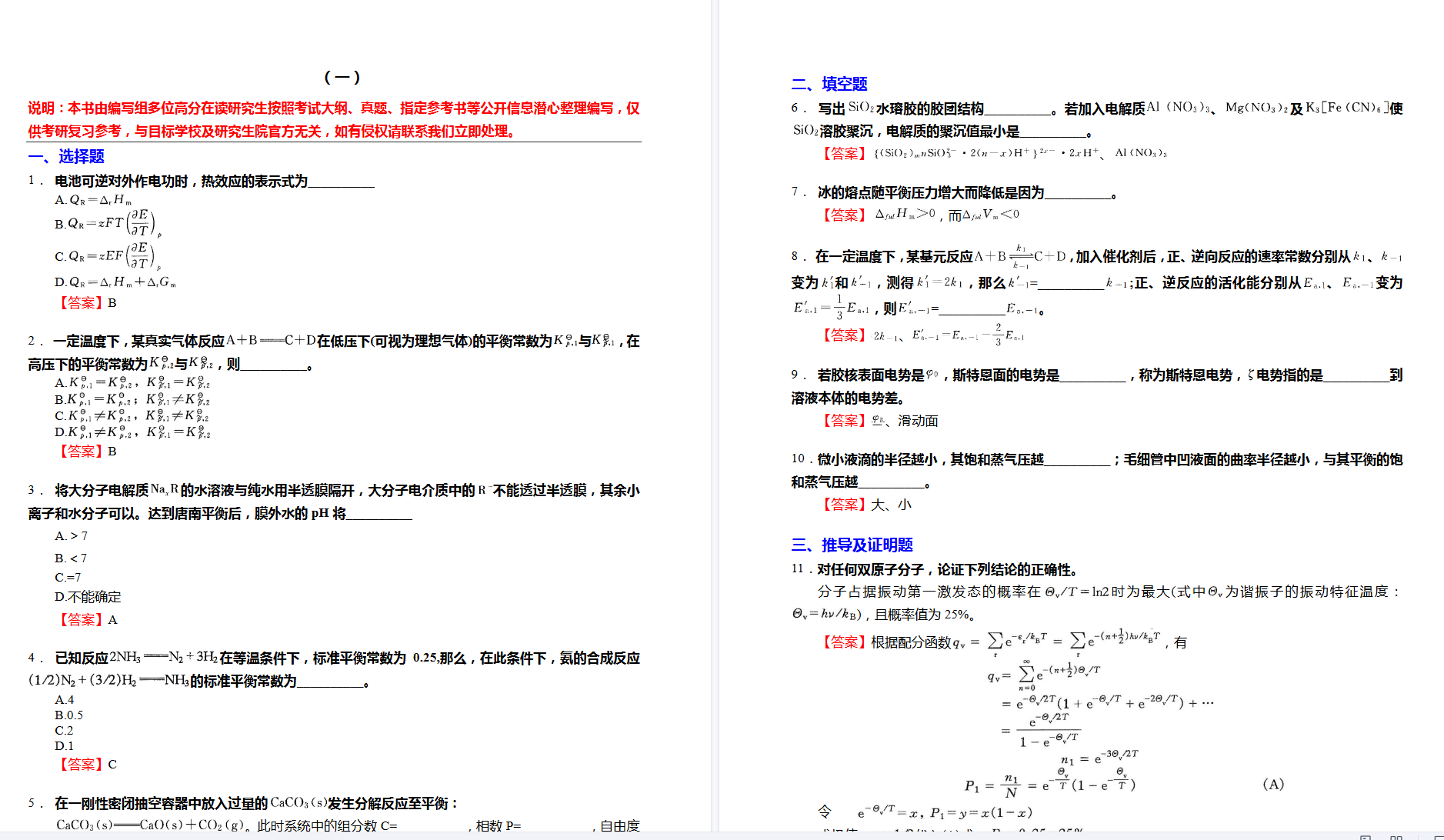 1. “阐释原理并推导关键公式”:不满足于记忆,要能清晰阐述并亲手推导如克-克方程、阿伦尼乌斯方程、能斯特方程等重要关系的来龙去脉与适用条件。