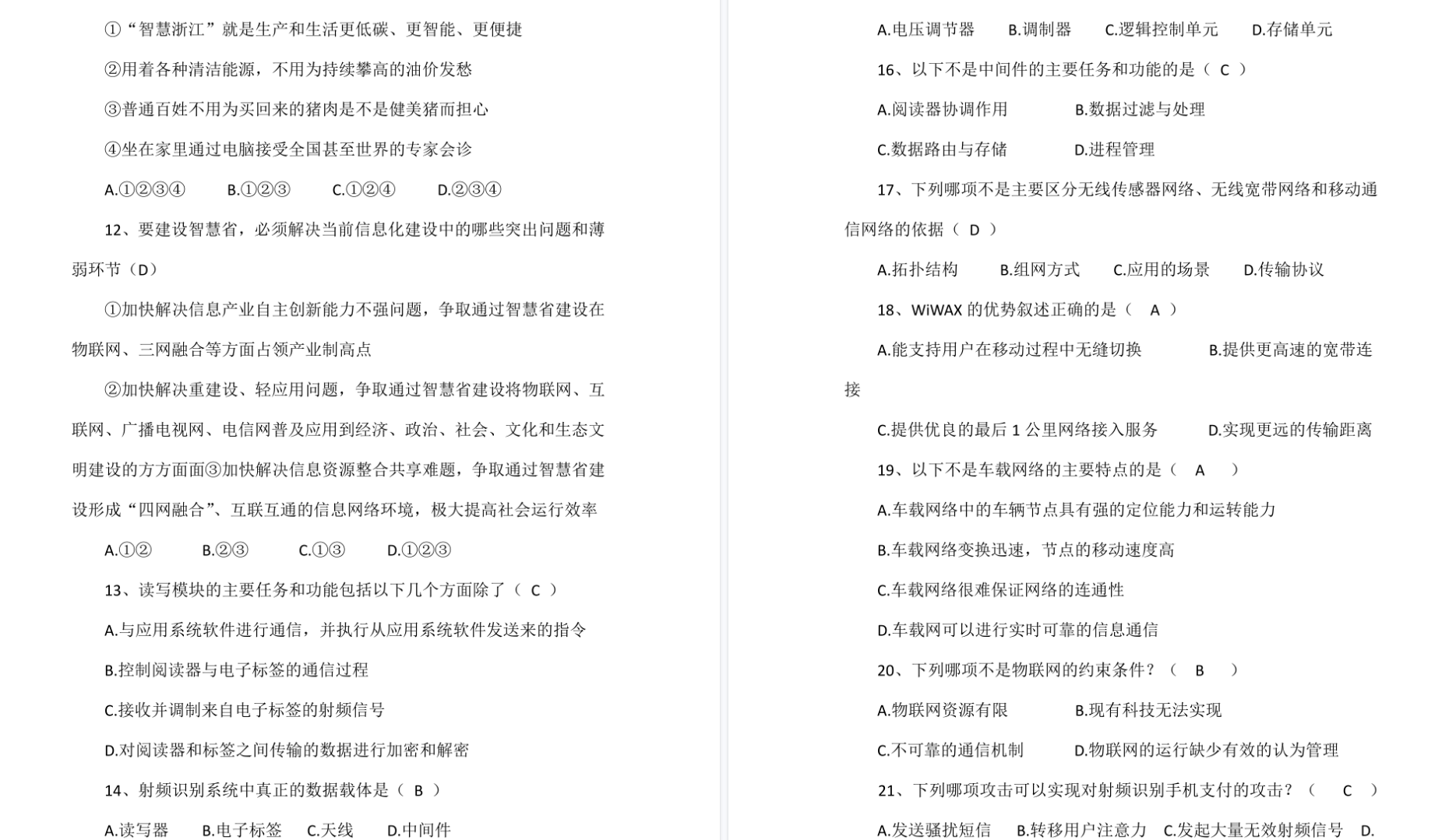 “对比核心无线通信与标识技术”:列表对比主流短距、广域网通信技术及自动识别技术在频段、功耗、速率、距离、成本、应用场景上的差异,这是应对选择题和分析题的关键。