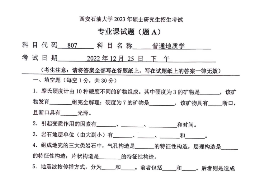 备考西安石油大学《807普通地质学》需立足院校考纲核心,紧扣“教材筑基、模块梳理、真题攻坚”的核心逻辑,精准适配其侧重地质基础理论、与油气地质应用结合的命题特点。核心备考资料优先锁定指定教材,推荐《普通地质学》(舒良树版),搭配西安石油大学本科讲义、配套习题集及近10年真题,明确地球圈层结构、矿物岩石、地质构造、动力地质作用、油气地质基础等核心模块,梳理“基础地质-油气关联”的内在逻辑,避免复习碎片化。