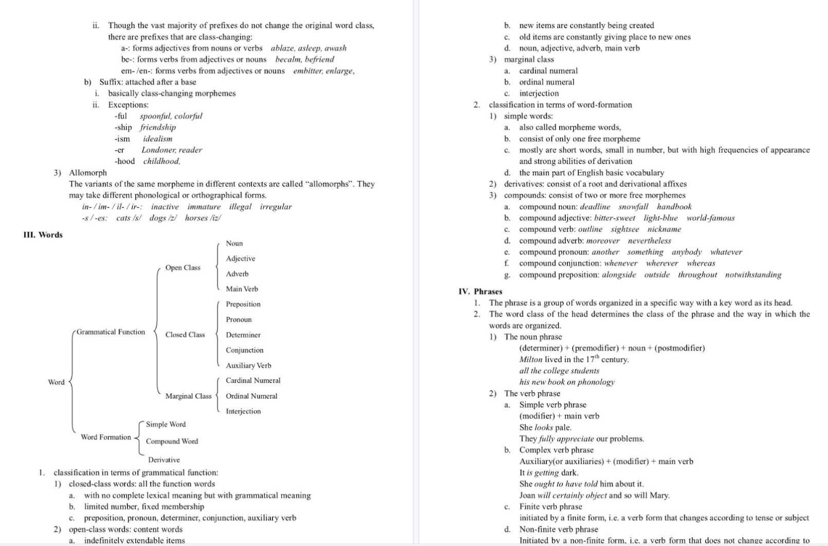 基石(词法):各类词的形态、类别与功能(重点是名词、动词、形容词/副词、限定词、介词)。