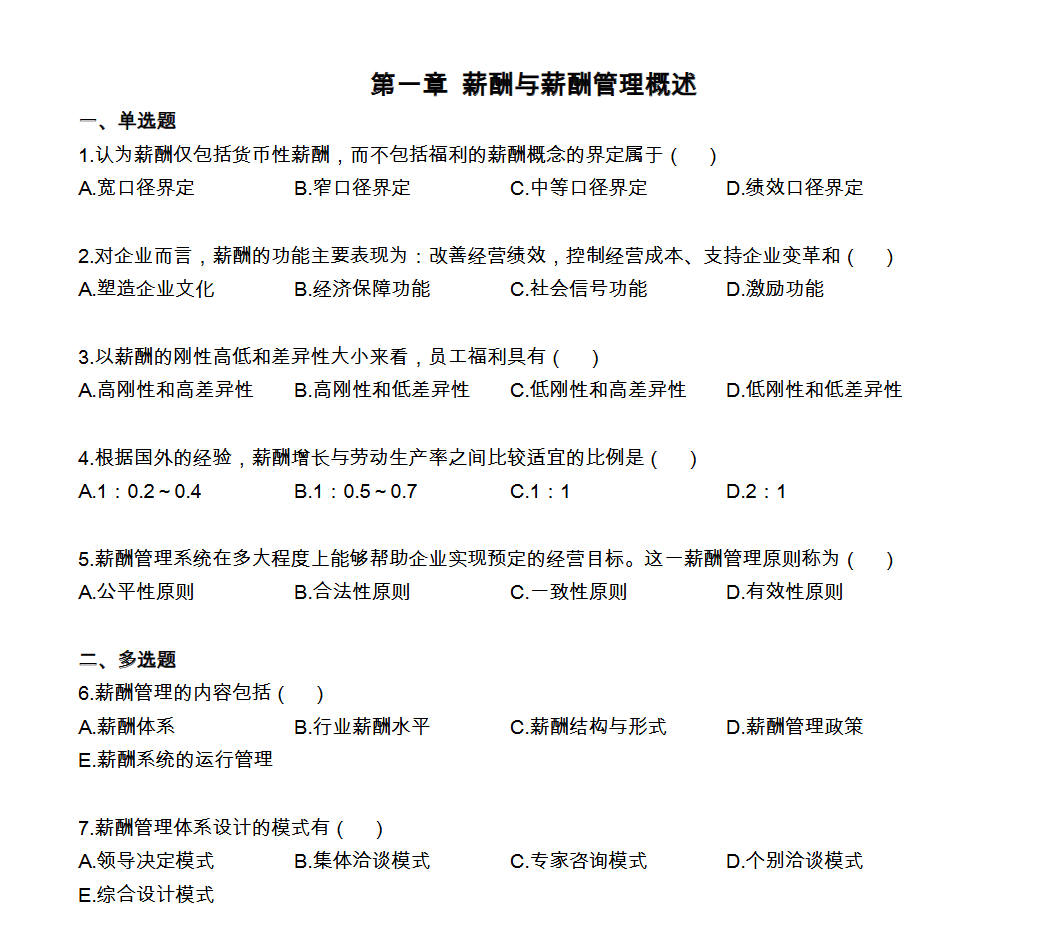 三、勤做真题,掌握命题规律 历年真题是备考的“黄金指南”。通过大量练习真题,可以直观感受题型(单选、多选、简答、计算、案例分析等)、分值分布和常考考点。对于计算题(如薪酬区间渗透度、薪酬比较比率等)要动手演算,确保公式运用熟练。对于简答和案例题,则要研究标准答案的表述逻辑和得分点,学习如何将理论知识与问题情境相结合,进行条理清晰的论述。