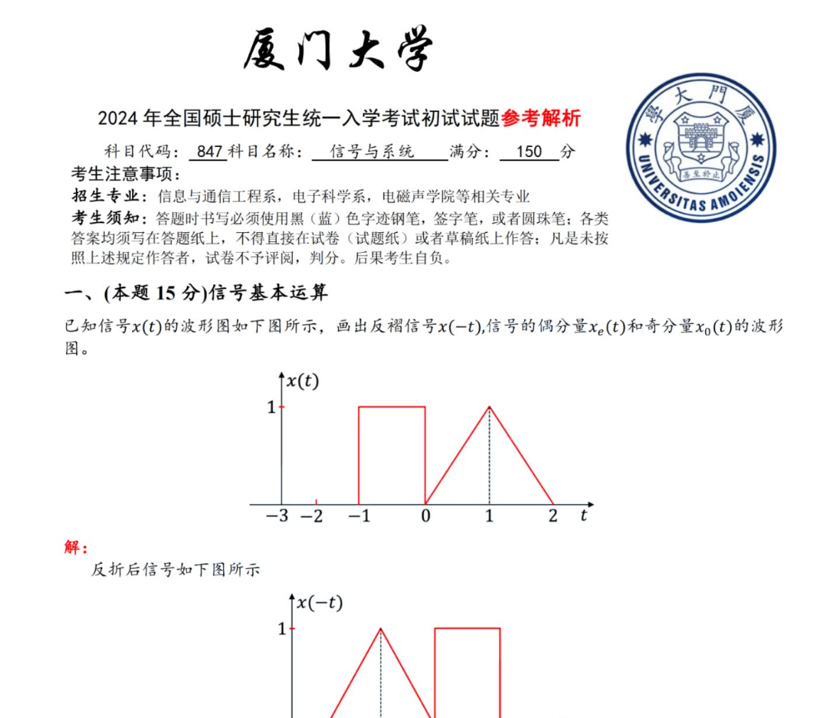 备考厦门大学《847信号与系统》需紧扣“基础夯实+公式熟练+逻辑清晰”核心要求,分三阶段系统推进。基础阶段(3-6月)核心是吃透指定教材,优先精读郑君里《信号与系统》(第三版),逐章梳理核心模块:信号与系统的基本概念、傅里叶变换、拉普拉斯变换、Z变换、线性时不变系统分析等。