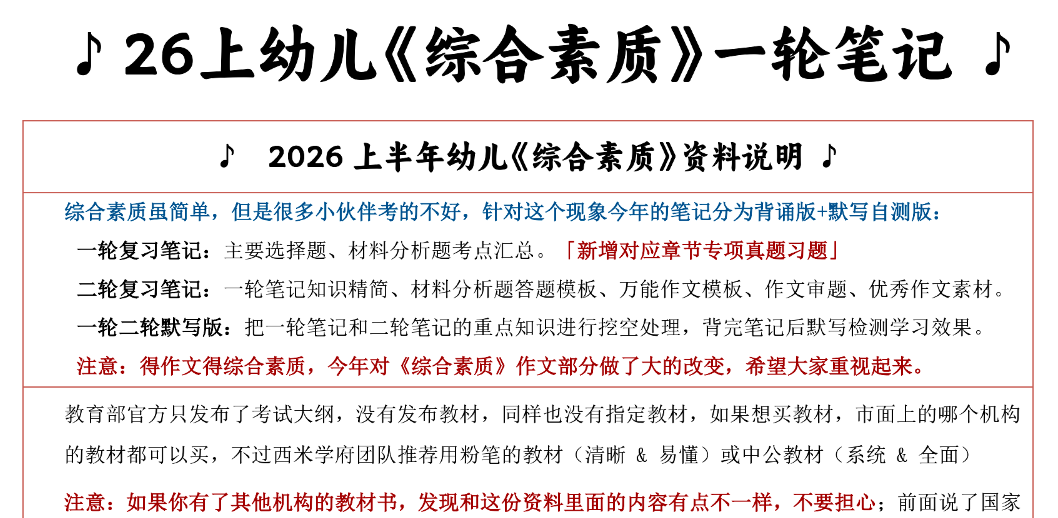 备考2026上西米学府幼儿园《综合素质》科目一,需紧扣西米学府备考核心逻辑,结合2026年上半年考情变化,立足幼儿园学段“重保育、强素养、贴合资教实践”的特点,兼顾知识点识记、答题技巧与幼教实操,依托西米学府的笔记精华与答题模板,高效提分,贴合幼儿园教资科目一备考规律。