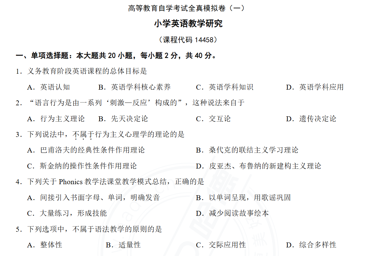 14458《小学英语教学研究》备考核心是掌握小学英语教学基础理论、课型规律及核心素养落地逻辑,紧扣“理论扎实+课型适配+素养导向”的备考要求,聚焦理论基础、课型实践、教研应用三大核心模块,通过“夯实基础—考点突破—实战演练”的节奏,实现理论记忆与英语教学设计、案例分析能力的同步提升。该科目侧重考查核心概念识记、英语教学规律应用、不同课型设计、教研方案撰写等内容,兼顾识记、理解与实践教研能力,具体建议如下: